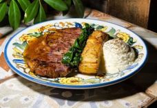 сочный стейк с гарниром из шпината и гратена, дополненный муссом из пармезана