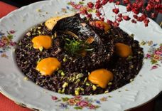 рис венере, пармезан, соус биск, осьминог, хлопья миндаля