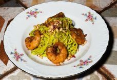 соус песто, креветки и кедровый орех. Рецепт родом из Лигурии, где свежесть базилика традиционно сочетают с морепродуктами